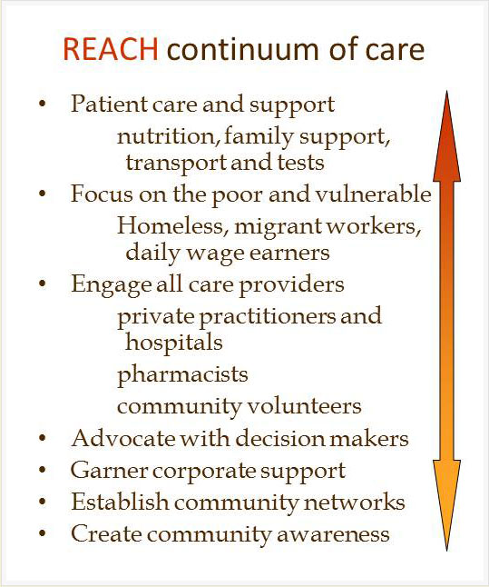 How this works: REACH facilitates effective and timely TB treatment for patients in the private sector, by encouraging private healthcare providers to participate in the DOTS programme and providing the necessary support for both patients and private practitioners.