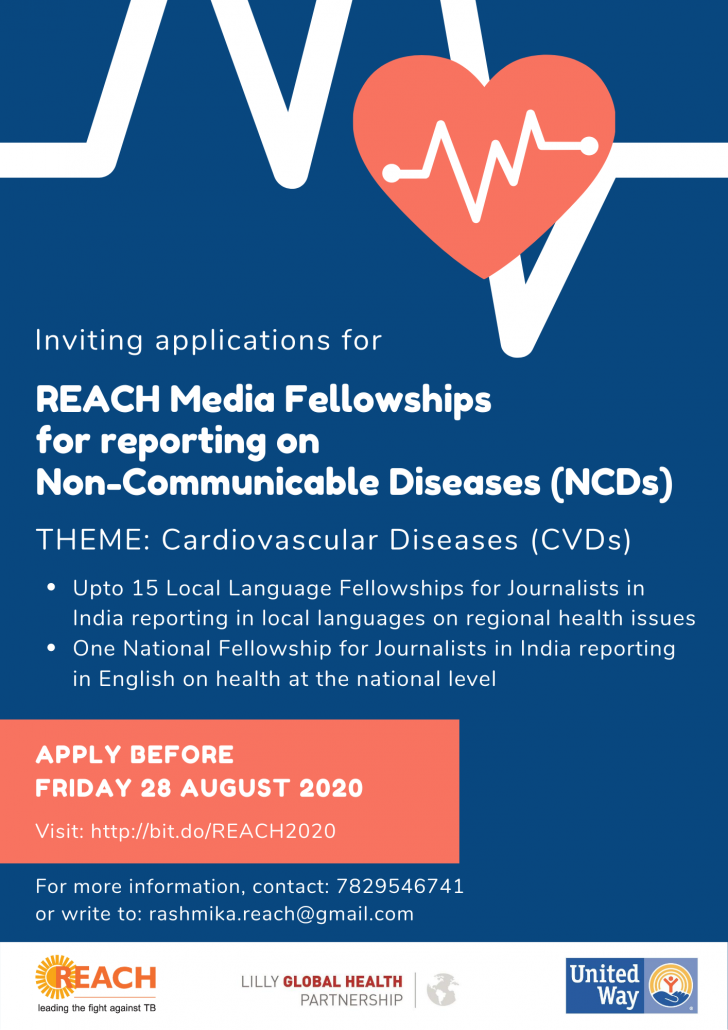 Applications are invited for the third edition of the REACH Media Fellowships for Reporting on Non-Communicable Diseases (2020-21). Journalists working for print or digital publications in India are eligible to apply to the Fellowship Programme.